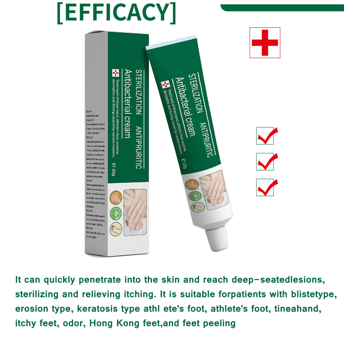 Efficacy: It can quickly penetrate into skin, reach deep lesions, sterilize and relieve itching. It is suitable for patients with blister, erosive, keratotic tinea pedis, tinea pedis, itchy feet, smelly feet, athlete's foot, foot peeling and so on.