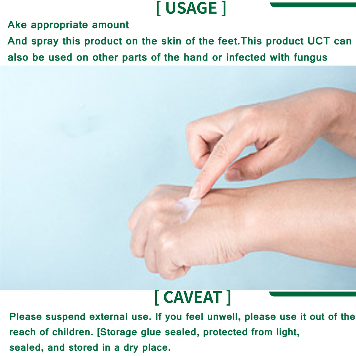 Usage: Take proper amount of this product and spray it on foot skin. This prodUCT uct can also be used in other parts of the hand or parts infected with fungi.