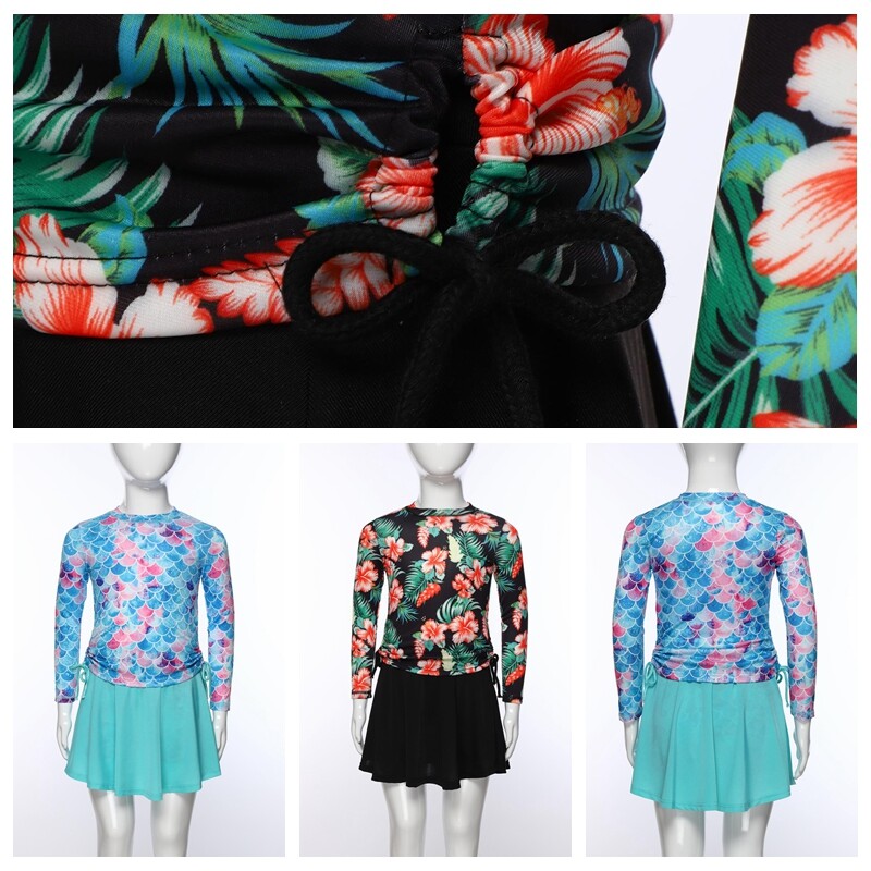 Round neck, long sleeves swim tops with drawstrings at two sides, 3D vibrant print make girl beautiful and fashionable.