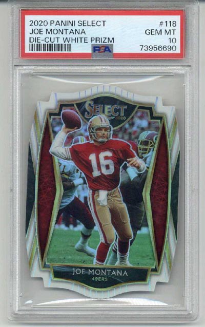 The item you are buying is a PSA GRADED and ENCAPSULATED 2020 Panini Select Premier Level Die Cut White Prizm #118 card of Joe Montana. The card was graded a 10 by PSA. This card comes from my personal collection. The plastic of the encapsulation has no cracks and is scratch free.