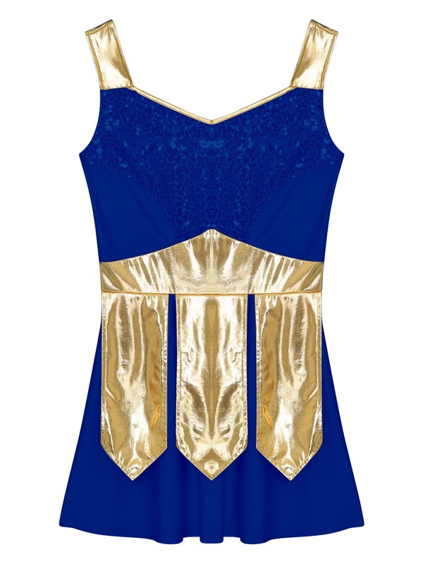 Decorated with sparkle sequins, and shiny metallic gold cloth patchwork at shoudler and waist, adding a sense of vintage.