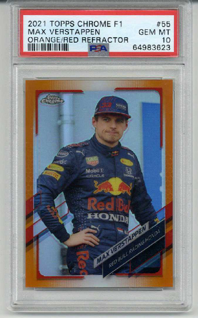 The item you are buying is a PSA GRADED and ENCAPSULATED 2021 Topps Chrome Formula 1 Orange/Red Refractor #55 card of Max Verstappen. The card was graded a 10 by PSA. This card comes from my personal collection. The plastic of the encapsulation has no cracks and is scratch free.