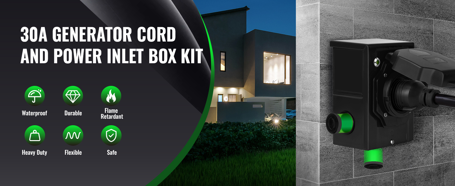 - 【Generator Extension Cable Set】1 * 30 Amp generator cord (25 feet) , 1 * 30 Amp generator inlet box (pre-drilled) , 1 x cable tie ,1 * user manual.