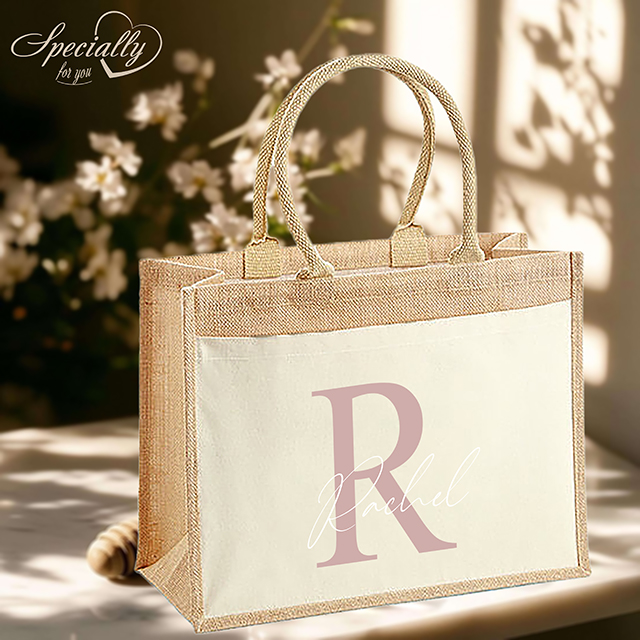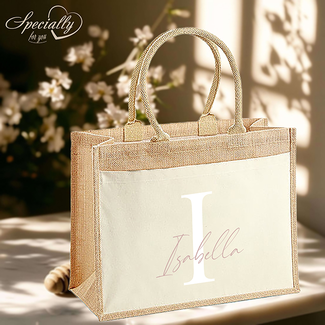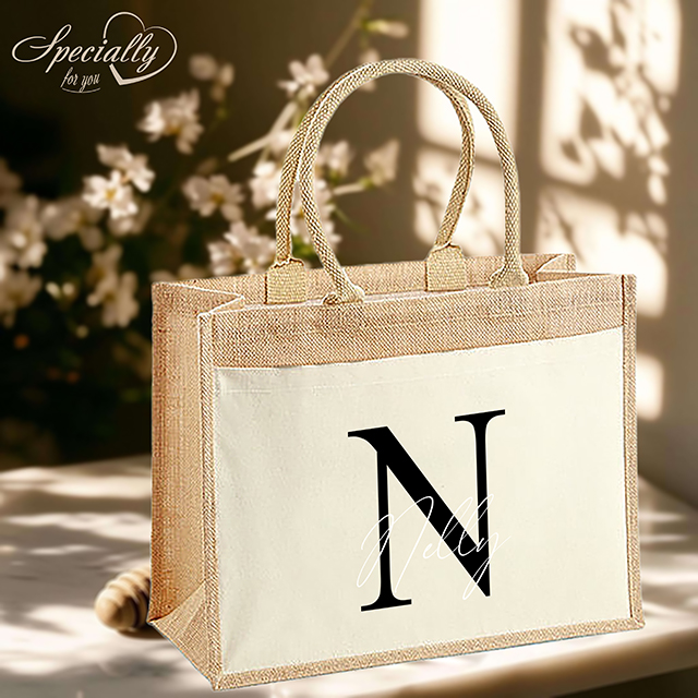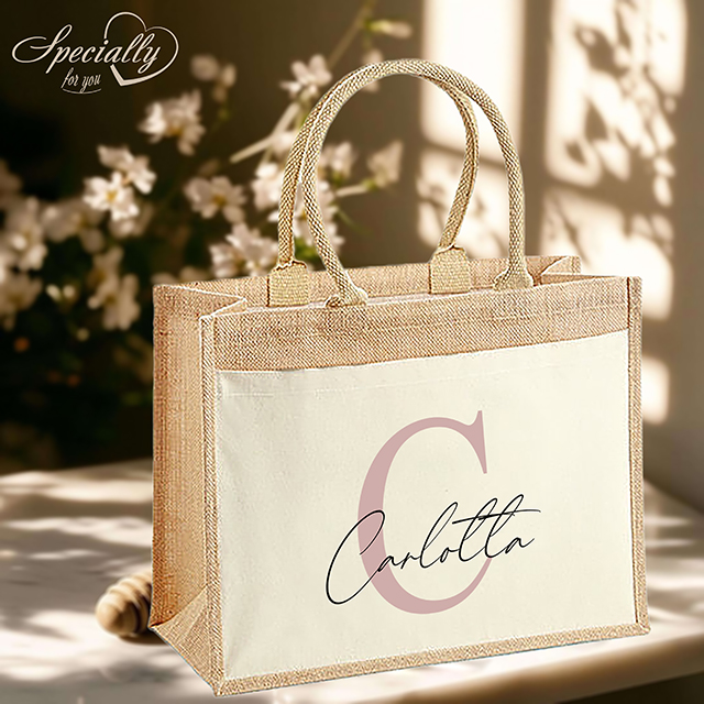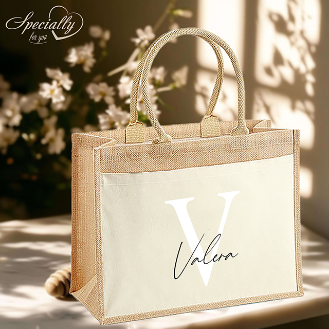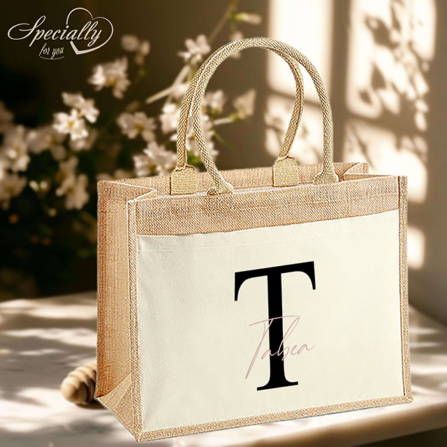 Leichte Baumwolltasche aus laminierter Jute, Vorderfach und Tragegriffe aus 100% Baumwolle mit personalisiertem Aufdruck eines Wunschtextes auf einem Buchstaben in verschiedenen Farbkombinationen.