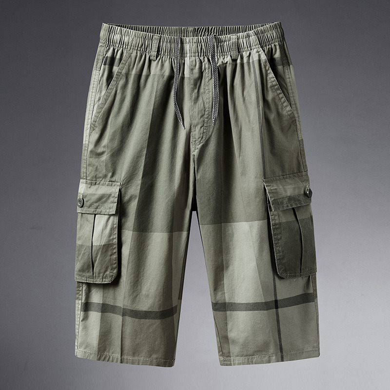 Men Cotton Elastic Waist Cargo Shorts 3/4 Pants Multi Pocket Capri Trousers Grey