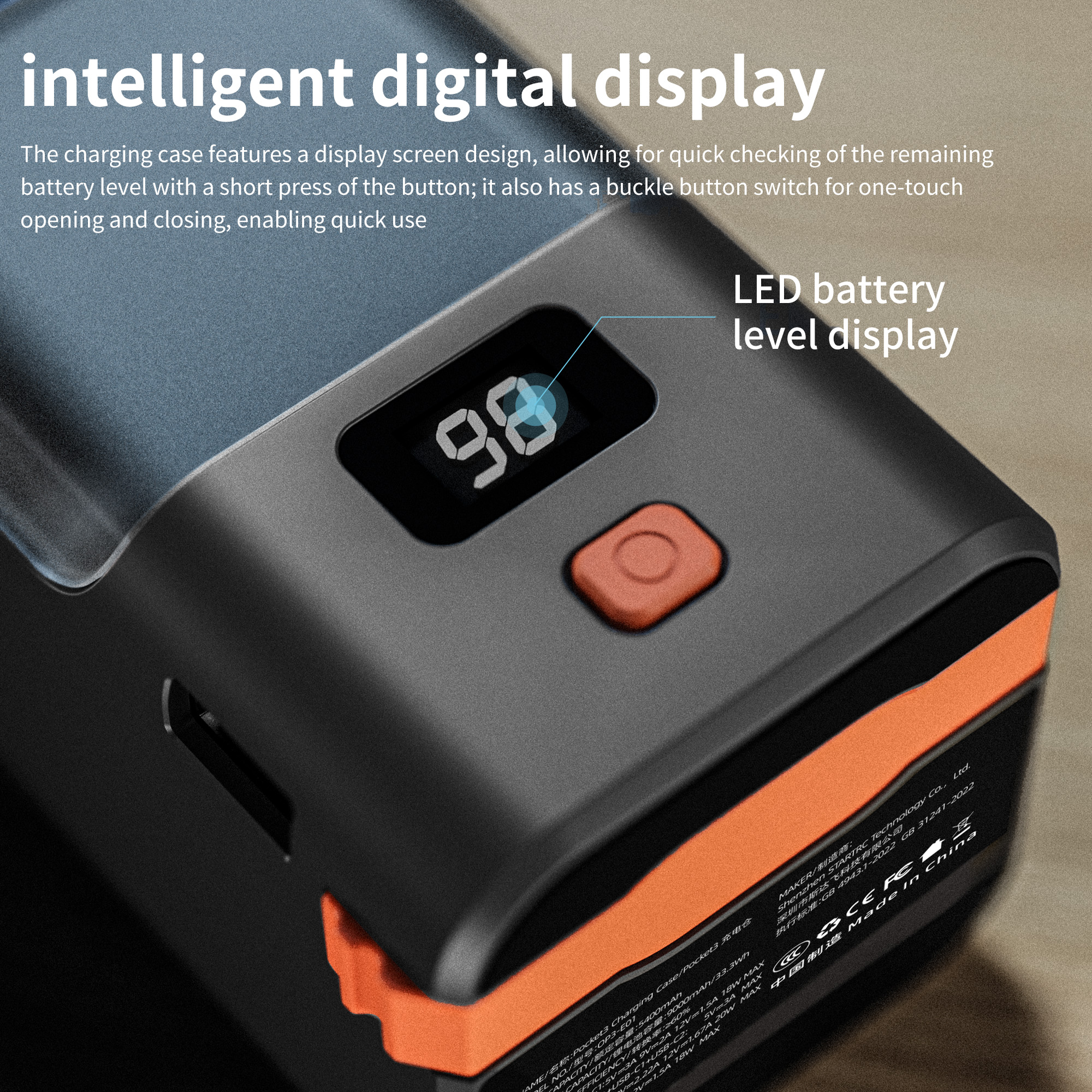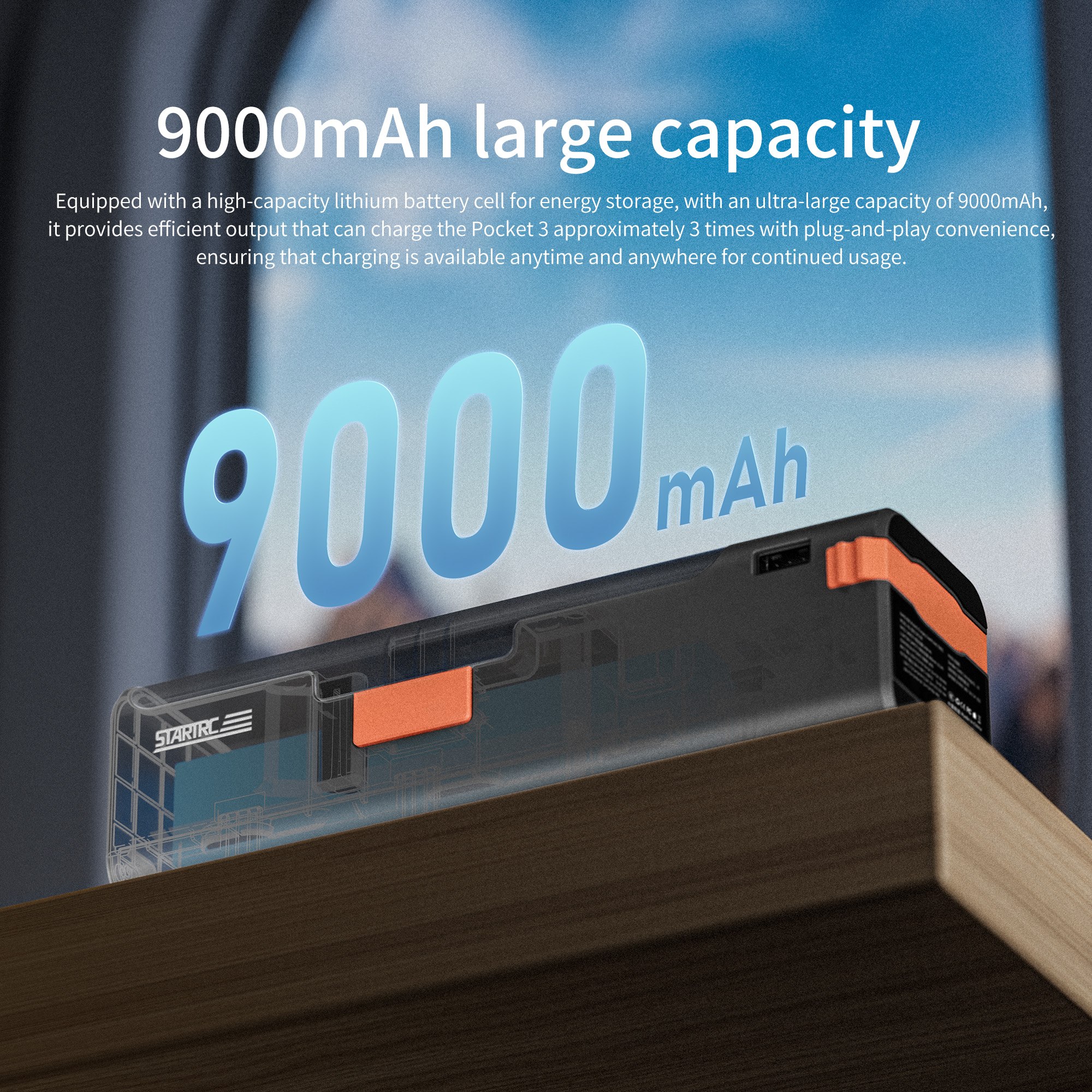 2. This device uses a high-capacity lithium-ion battery with an ultra-large capacity of 9000mAh, providing efficient output. It can charge the Osmo Pocket 3 approximately 3 times, with plug-and-charge functionality, allowing charging anytime, anywhere, ensuring continuous power output.