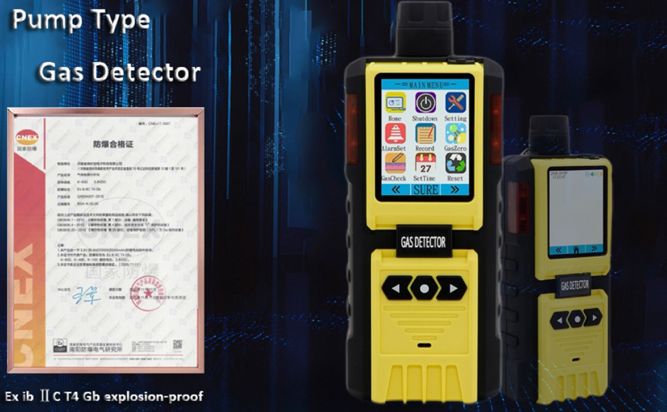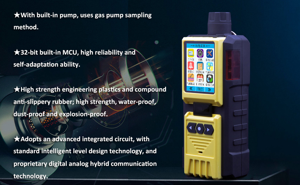 Gas detector with built-in pump is a new intelligent gas detector, which adopts an advanced integrated circuit, with standard intelligent level design technology, and proprietary digital analog hybrid communication technology. The detector is of excellent sensitivity and repeatability, which makes it very easy to use and maintain. Thus greatly meets the safety requirements of industrial sites with high reliability. The detector is made of high-strength engineering plastics, compound non-slip rubber, which is of high strength and good hand feeling. what's more, the detector is water-proof, dust-proof and explosion-proof. It is widely used in petroleum, chemical, environmental, metallurgy, refining, gas transmission and distribution, biochemical medicine, agricultural and other industries.
