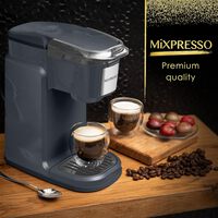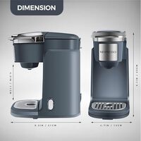 Brand Mixpresso Color Dark Grey Product Dimensions 8"D x 5"W x 9"H Special Feature Auto Shut-Off, Removable Tank, Single Cup Brew Coffee Maker Type Coffee Infuser Capacity14 ounces MaterialPlastic Wattage800 watts Voltage110 Volts About this item Instant Single Cup Coffee Machine: Our single serve coffee maker is what you need to start your day productively! Compatible with k-cups and easily programmable, our coffee machine can instantly brew your favorite ground coffee with our quick-brewing technology! Size: 9Inch H x 4.7Inch W x 8.2Inch L 100% Automatic Function: Make your favorite flavors of single cup pods or ground coffee instantly since the preheating time is just 2 minutes. Hold the button to drain the water and effortlessly clean the inner part of the 1 cup coffee maker as well! Premium Construction For Coffee Lovers: An 800-watt powerful single cup coffee maker is perfect for a single or even for families whose sleeping schedules do not coincide. Program your new electric coffee maker to prepare a 4 - 12 oz cup of coffee and wake up with pure energy and delicious taste! Mini Slim Coffee Maker: you’re probably busy with little time to replace coffee filters or clean messy kitchen accidents! Now, you can wash the single cup serve pods drawer under the tap and quickly fill the small coffee maker under the tap! Single Serve Coffee Maker-12oz: portable small coffee brewer compatible with 1.0 and 2.0 pod coffee capsules to meet variety needs. Also suitable for using ground coffee (reusable filter NOT included) to create your private cafe at leisure or busy moments. The single serve coffee brewer supports for travel mugs up to 4’’ tall. Customer Support: Your Mixpresso coffee makers is covered under the umbrella of our warranty. Ideal gift for Christmas, birthdays, anniversaries, Mother's Day, New Year, housewarming, etc.