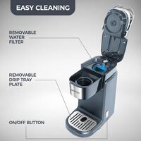 • 100% Automatic Function: Make your favorite flavors of single cup pods or ground coffee instantly since the preheating time is just 2 minutes. Hold the button to drain the water and effortlessly clean the inner part of the 1 cup coffee maker as well!