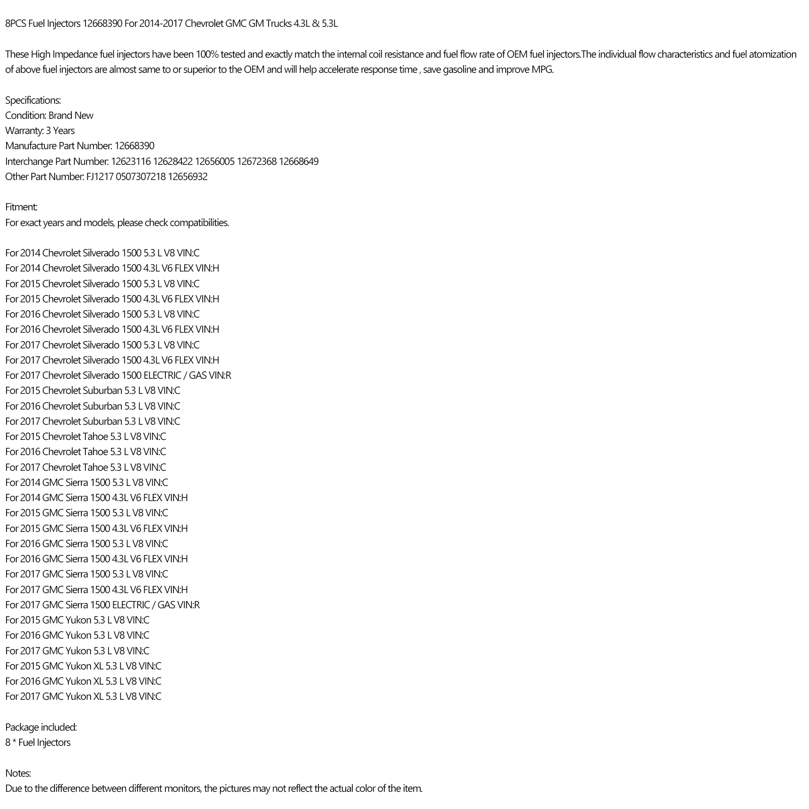8PCS Fuel Injectors 12668390 For 2014-2017 Chevrolet GMC GM Trucks 4.3L & 5.3L