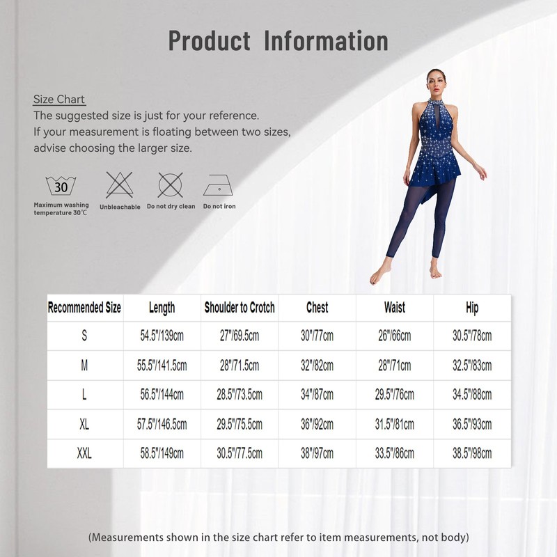 Women’s skirted jumpsuit with color block and sparkly rhinestone snowflakes is eye-catching enough to make you the spotlight in any performance.