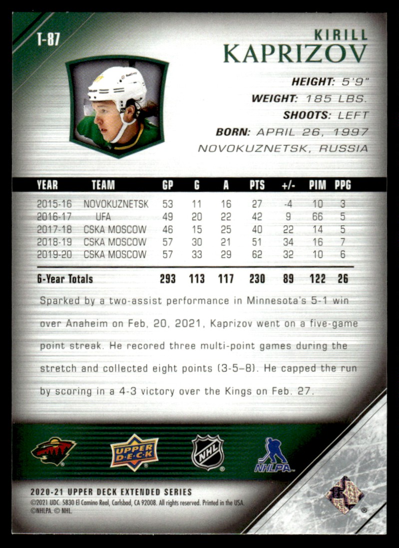 | 2020-21 Upper Deck '05-06 Upper Deck Tribute Kirill Kaprizov YG RC Minnesota |