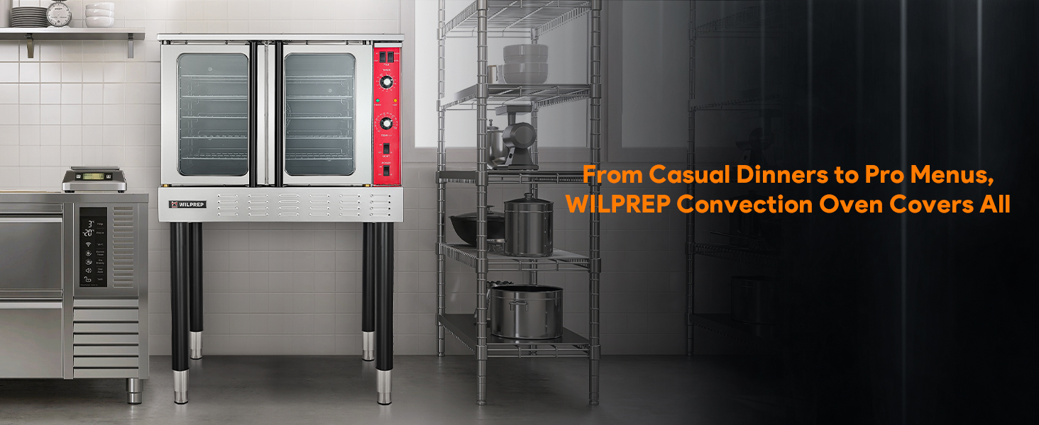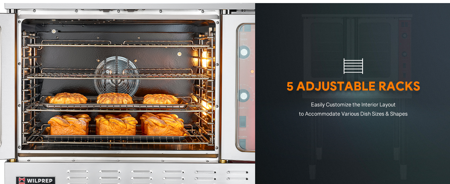 Large Cooking & Baking Capacity: Wilprep's electric commercial convection offers a spacious 7 cu. ft. chamber with 5 racks that can rest on 11 sets of brackets. Benefit from a variety of rack configurations to best accommodate your food from cakes to pizzas.