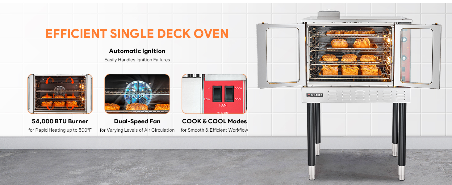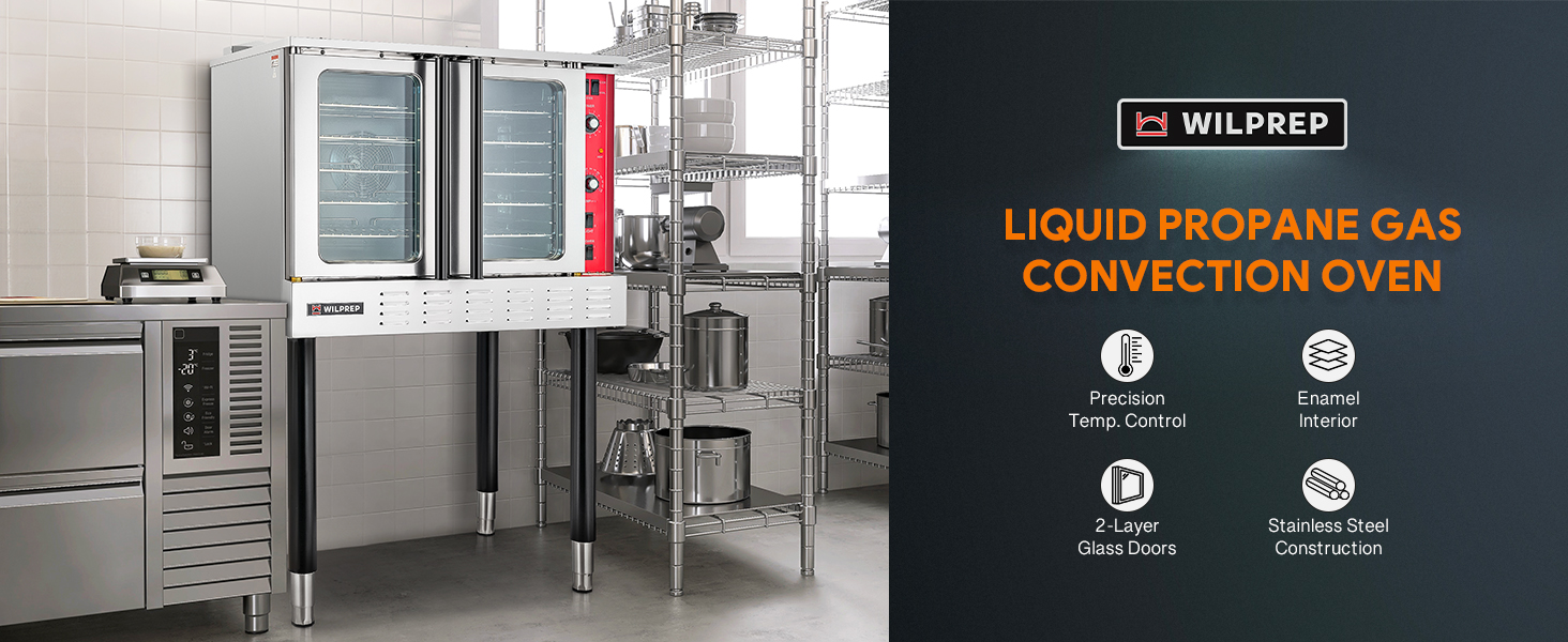 Powerful Performance: With 54,000 total BTU and an automatic thermostat, our LPG convection oven precisely reaches temperatures from 150 to 500°F for baking diverse foods. A liquid propane gas and a 120V electrical connection are required for operation.