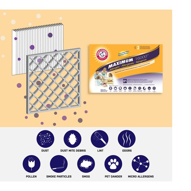 CLEANER INDOOR AIR: X size-pack of MERV 11 of ARM & HAMMER™ MAXIMUM 16000™ air filters. Designed to help trap unwanted particles in your indoor air and reduce odors. HELPS TRAP AIRBORNE CONTAMINANTS: The ARM & HAMMER™ MAXIMUM 16000™ Air Filter is rated as a MERV 11, meaning it can trap up to 87% of large airborne particles. This filter effectively reduces airborne allergens, including pollen, pet dander, dust mite debris, microscopic allergens, smoke and VOCs. LASTS UP TO 90 DAYS: To maintain optimal filtration performance, check your home air filter every 60-90 days. Regularly replacing air filters helps to keep your HVAC unit running efficiently and can help reduce energy usage. PROUDLY MADE IN THE USA: Each air filter is manufactured and assembled here in the USA. Replacing or installing the filter is quick and easy! Simply follow the instructions on the packaging. To ensure proper fit, measure your current air filter for the exact size and compare it to ours.