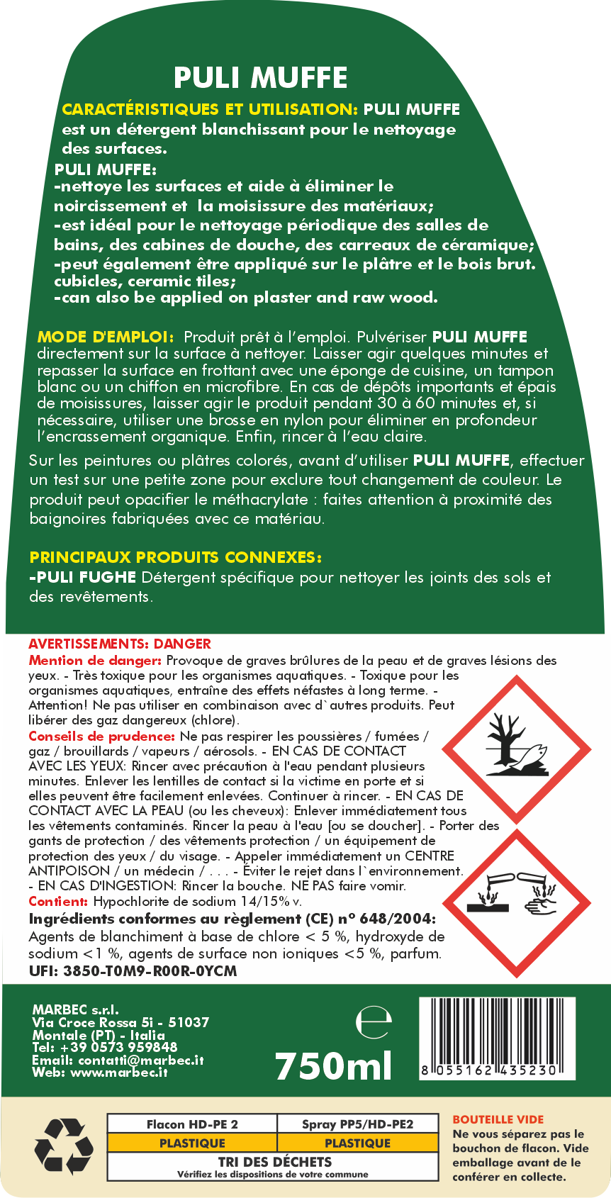 PULI MUFFE \u00E8 un detergente sbiancante per la pulizia delle superfici.