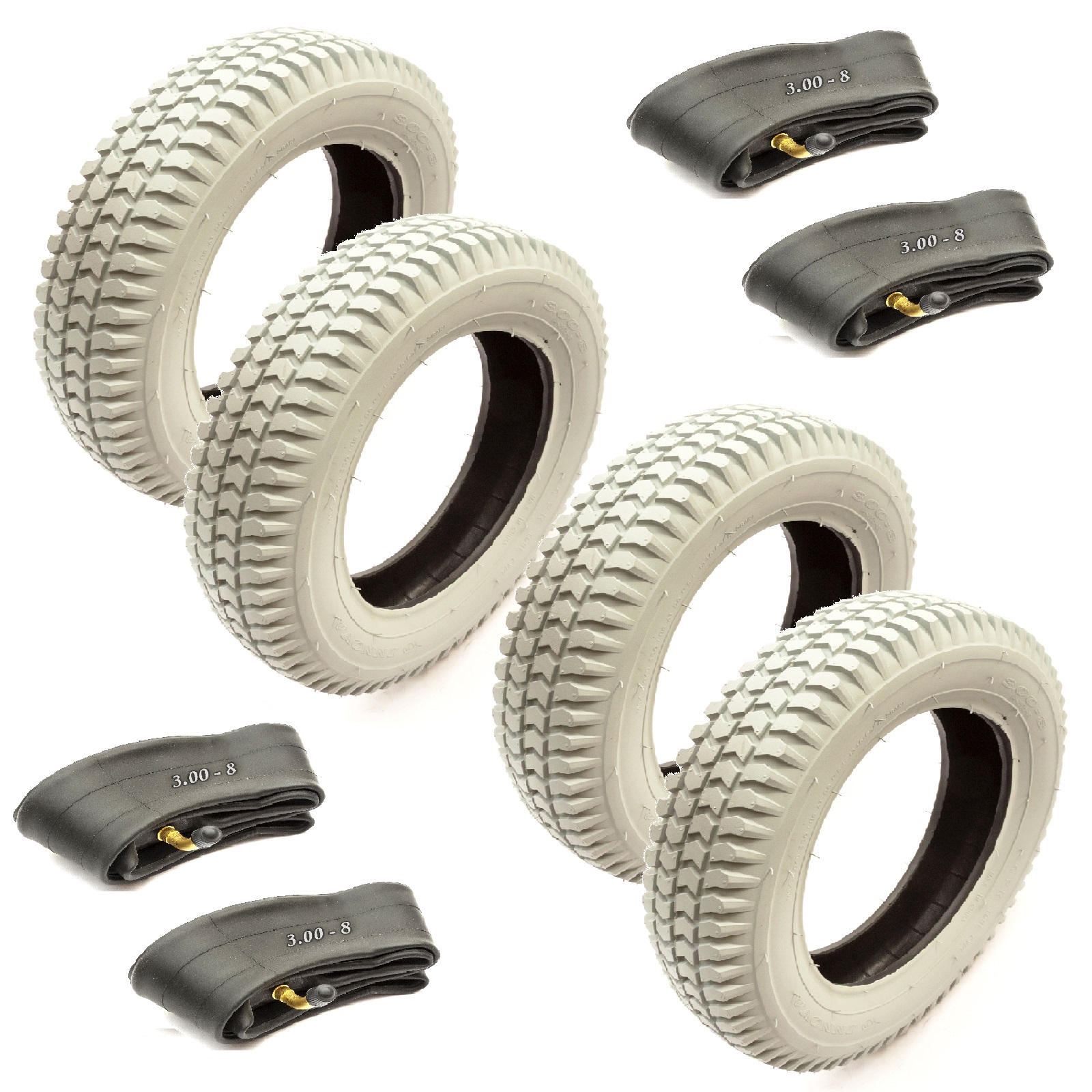 4x Mobility Scooter Tyre 3.00-8 & Inner Tube Bent Valve Block Tread 4 Ply Grey