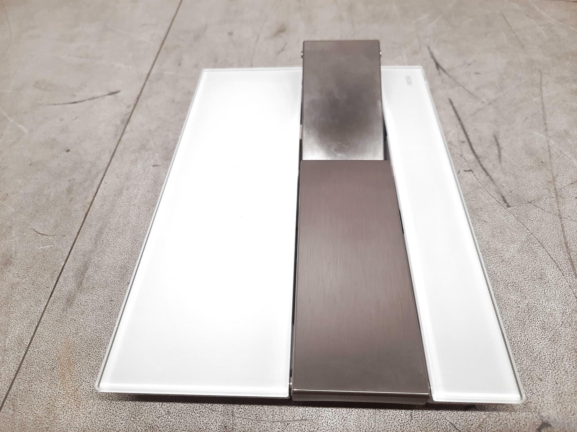 Plaque de commande pour éviers TECE, possibilité d'actionnement par l'avant ou par le haut. Plaque de verre plate pour montage en pose ou montage affleurant en combinaison avec un support de montage. Inclus dans la livraison : connecteurs (barres de pression) et vis de fixation.