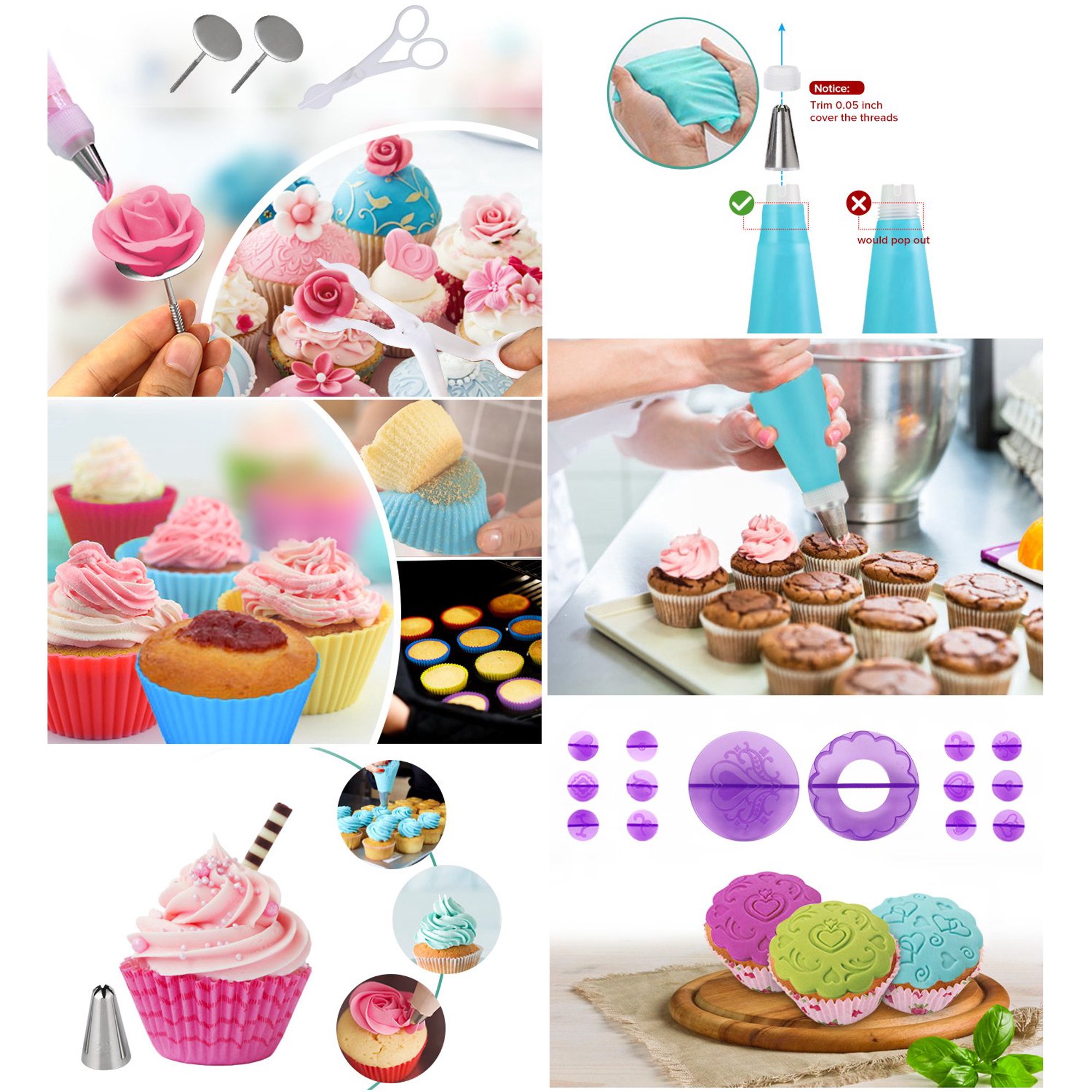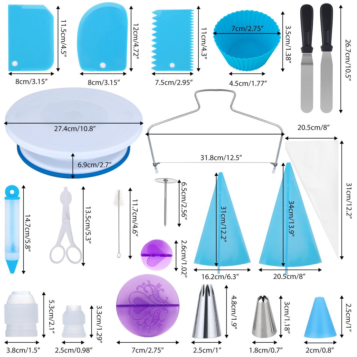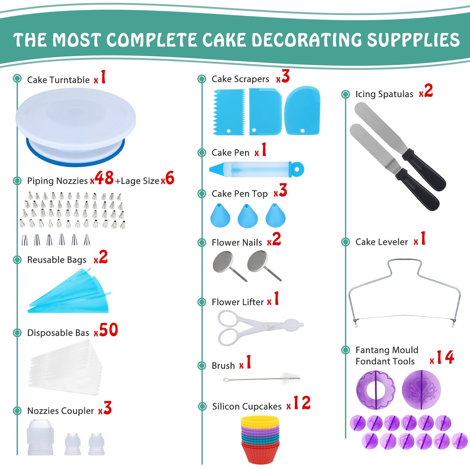 【Complete Cake Decorating Set】1 cake turntable, 1 cake cutter, 48 stainless steel piping tips, 6 large stainless steel piping tips, 2 reusable pastry piping bag, 3 cake couplers, 3 cake scrapers, 2 flower nails, 1 squid scissors, 1 cleaning brush, 12 silicone cupcake molds, 14 fondant mold tools, 50 disposable piping bags, 1 cake pen syringe, 3 syringe pen head, 2 stainless spatulas (6 inches). Meet your various needs!