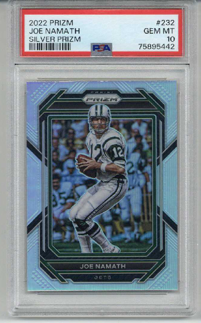 The item you are buying is a PSA GRADED and ENCAPSULATED 2022 Panini Prizm Silver Prizm #232 card of Joe Namath. The card was graded a 10 by PSA. This card comes from my personal collection. The plastic of the encapsulation has no cracks and is scratch free.