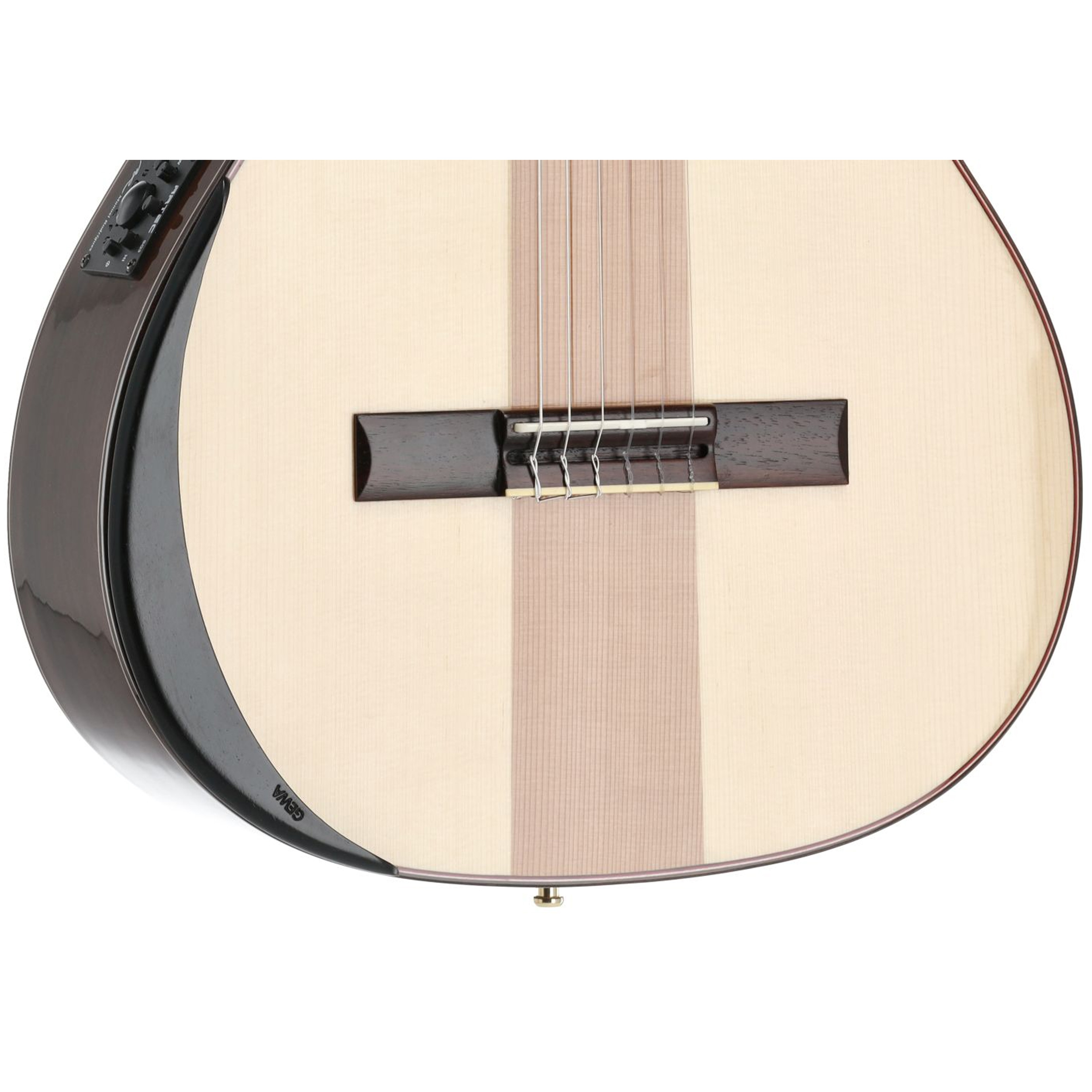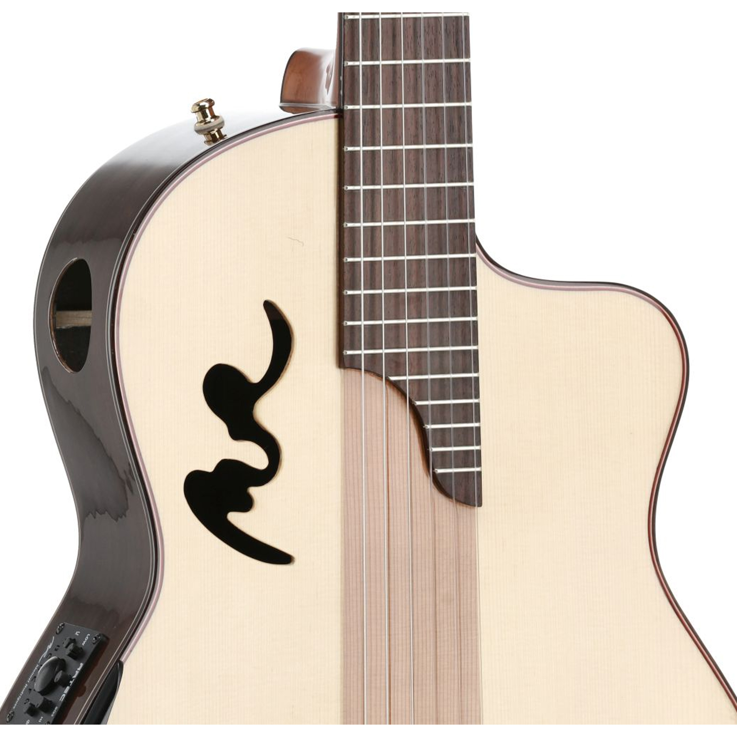 • Manuel Rodríguez by ARTEC SQ-3 3-band EQ preamp with new Solidflex bridge pickup, combines the advantages of flexible cable pickups with the power of rigid piezos. Controls: volume, bass (100Hz), midrange (800Hz), treble (4kHz), switch: phase reverse (anti-feedback), tuner. The tuner mutes the output signal and works even if there is no jack plug in the output socket. Attention: Tuner does not switch off automatically!