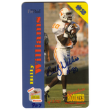These collectible phone cards are part of the "Headed for the Hall of Fame" insert set from the Destiny Pro Football Elite series, officially licensed by Players Inc and WorldCom. Each card features a prominent NFL football player in action during a game, emphasizing their athletic skill and posed with the football. The set is complete with 8 different cards, each displaying 10 units.