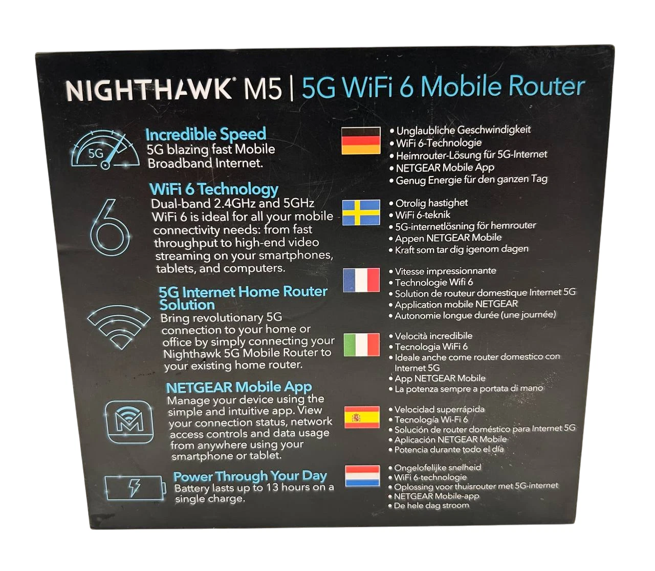 Der Netgear Nighthawk M5 ist ein leistungsstarker mobiler 5G-Router mit neuester WiFi 6 Technologie (AX1800). Er bietet ultraschnelles Internet, ideal für unterwegs, Home Office oder als stationärer 5G-Router in Kombination mit einem bestehenden Netz. Dank Touchscreen ist die Bedienung besonders einfach und intuitiv.