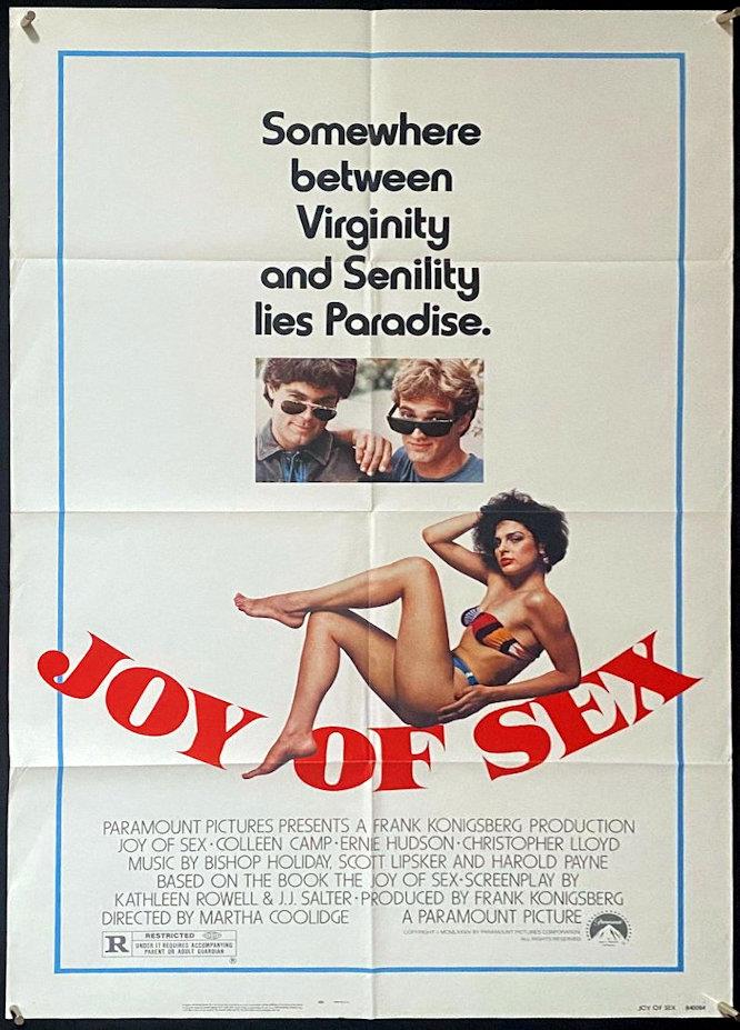 Joy of Sex, the 1984 Martha Coolidge romantic comedy ("Somewhere between Virginity and Senility lies Paradise."; "Screenplay by Kathleen Rowell & J.J. Salter"; "Based on the book 'The Joy of Sex'") starring Colleen Camp, Ernie Hudson, Christopher Lloyd, Cameron Dye, and Michelle Meyrink