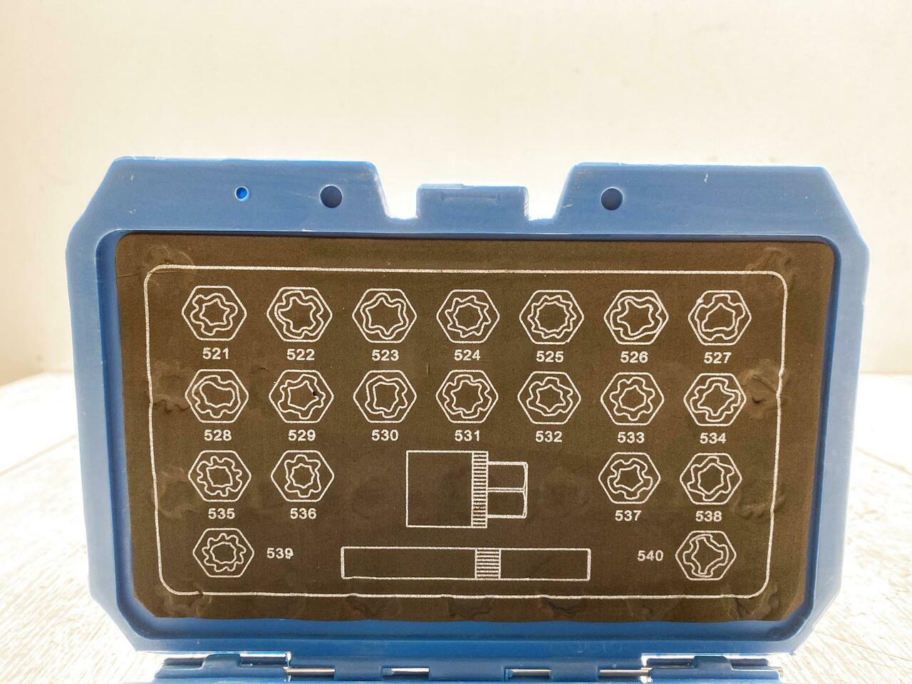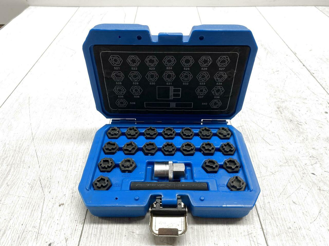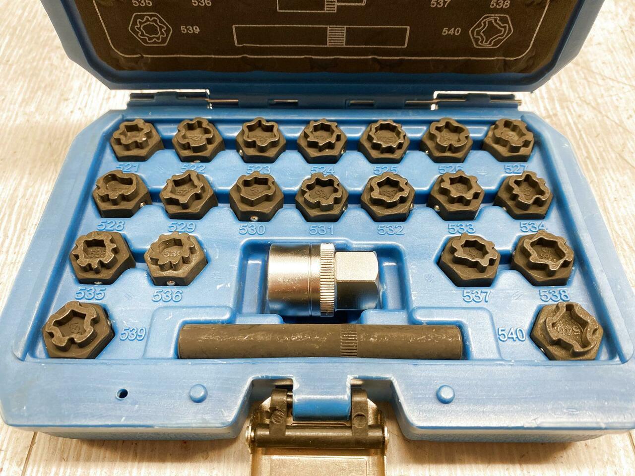 Contient 19 clés nécessaires pour desserrer les écrous de roue qui permettent d'ouvrir les serrures de jante en usine sans les endommager. Avec profils 41, 42, 43, 44, 45, 46, 47, 48, 49, 50, 51, 52, 53, 54, 55, 56, 57, 58, 59 et 60