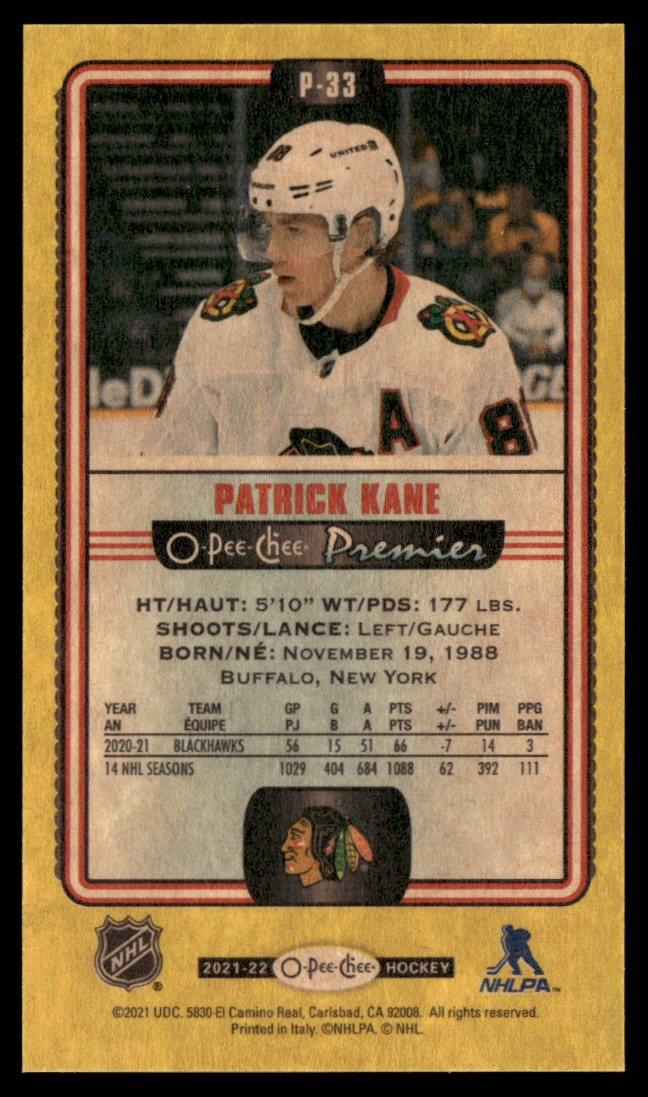 | 2021-22 O-Pee-Chee Premier Tallboys yellow Patrick Kane #P-33 |