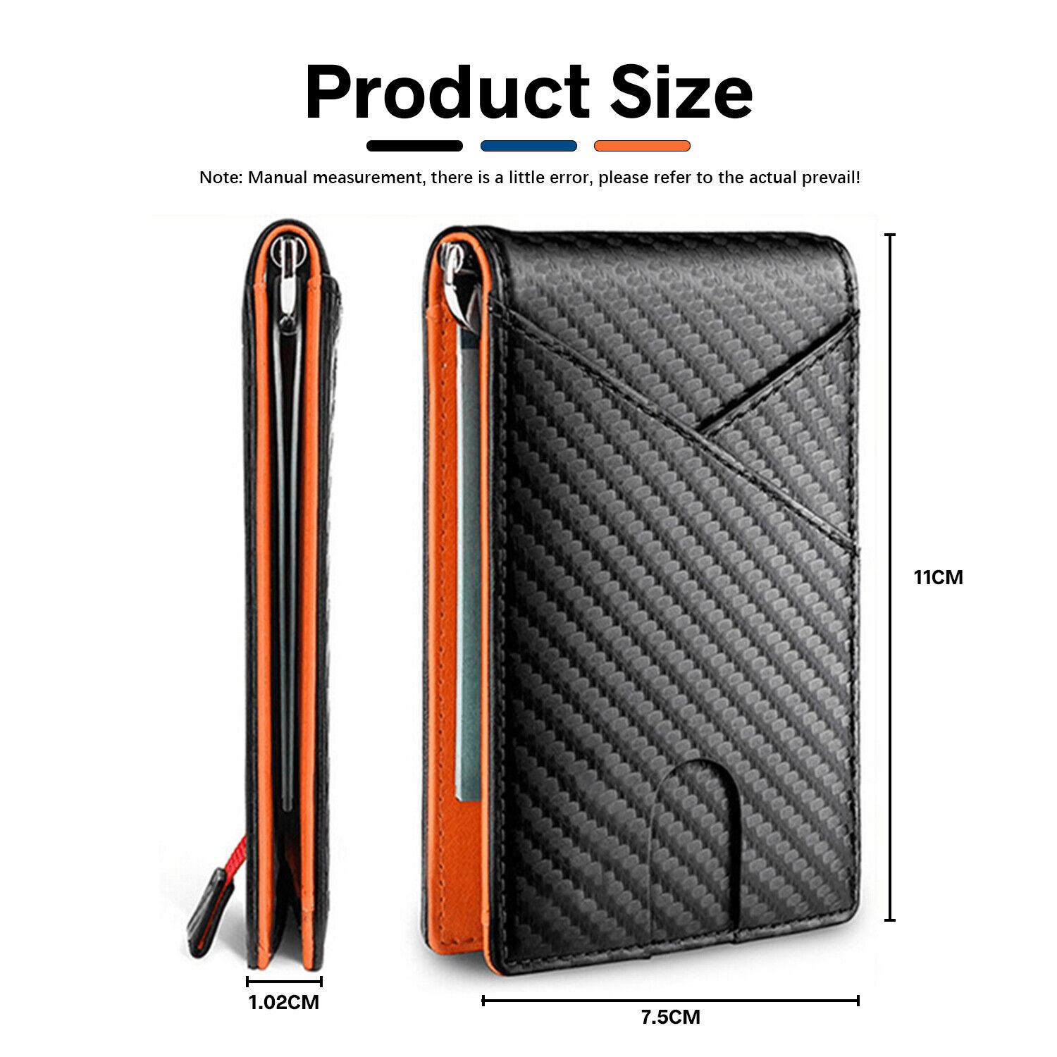 We kept the dimensions of our slim wallet to 4.3" x 2.9" x 0.4"(11cm*7.5cm*1.02cm). It will fit in your pocket perfectly without bulging out