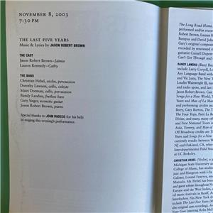 This is a Playbill from the November 8, 2003 concert of The Last Five Years. The show was preformed at The Great Hall at The Cooper Union in New York. Music and Lyrics for The Last Five Years are by one this concerts stars Jason Robert Brown . The other star of this musical is Lauren Kennedy from Broadway’s Side Show, Sunset Boulevard, & Les Miserables. The Program (Playbill) for this show is only 4 pages. The contents include the credits and song list only no ads. The Playbill is in Excellent Condition. No rips or tears. The Playbill has the date of the performance November 8, 2003 I have thousands of Playbills please email me with any requests.****