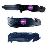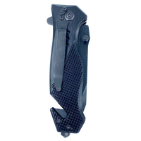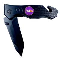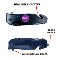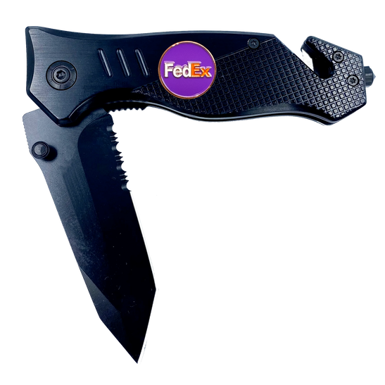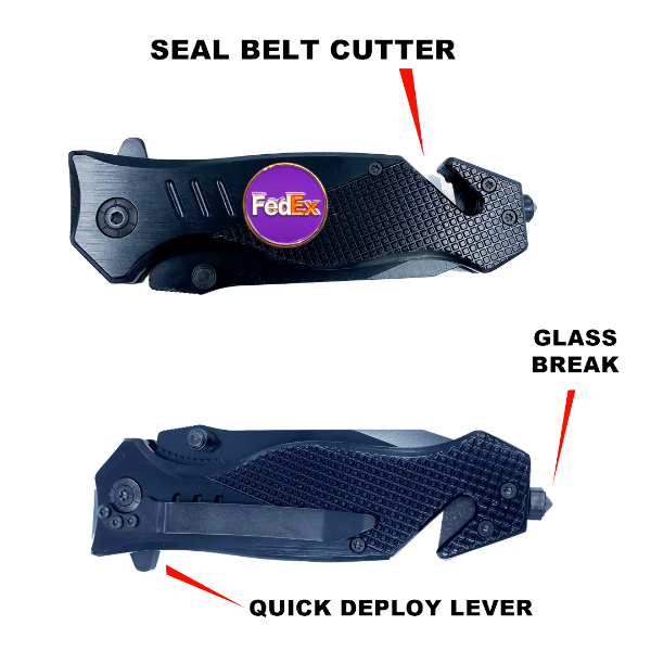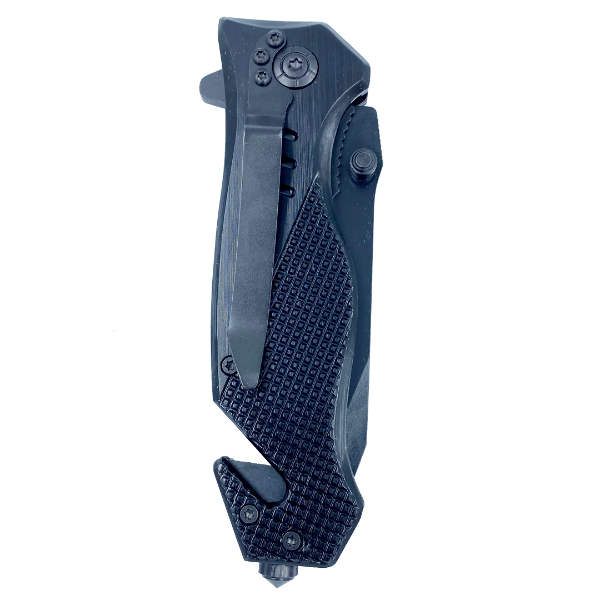 The knife features a steel blade with an aluminum handle and a pocket clip. It weighs 5.2 oz. This rescue tool features a built-in seatbelt cutter, stainless steel knife blade, and glass breaking tip. The stainless steel blade is 3.5 inches and 3mm thick. It has a 4.75 inch closed length and fits in EMT holsters. It has a built-in safety lock and hand grip for emergency situations and rescue.