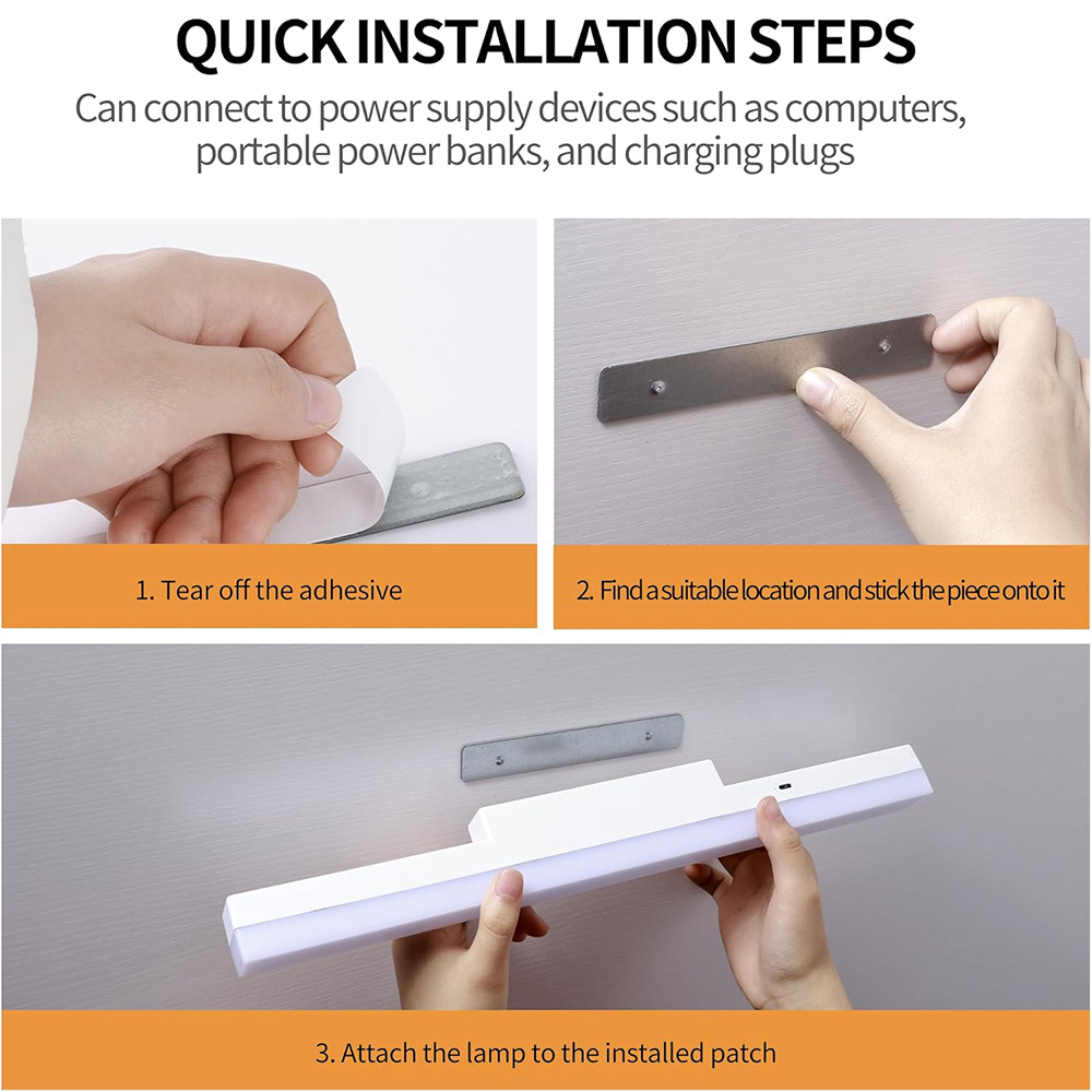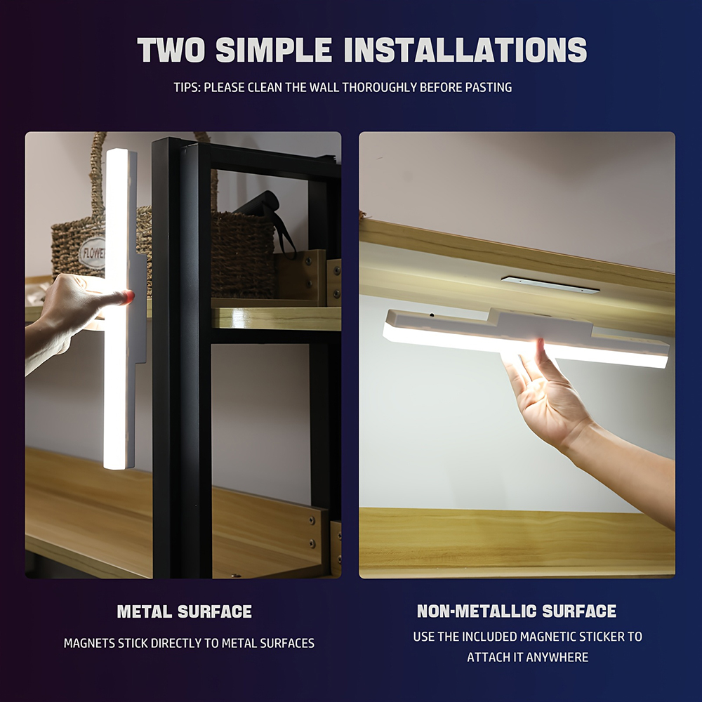 Free Install: Wall Mount and Portable. The magnetic design of the induction lamp can be attached to the surface of iron objects. and with an adhesive base, you can stick the base on a flat and clean surface and mount the light on the wall, or take the light off from the wall and use it as a flashlight or a bedside lamp.