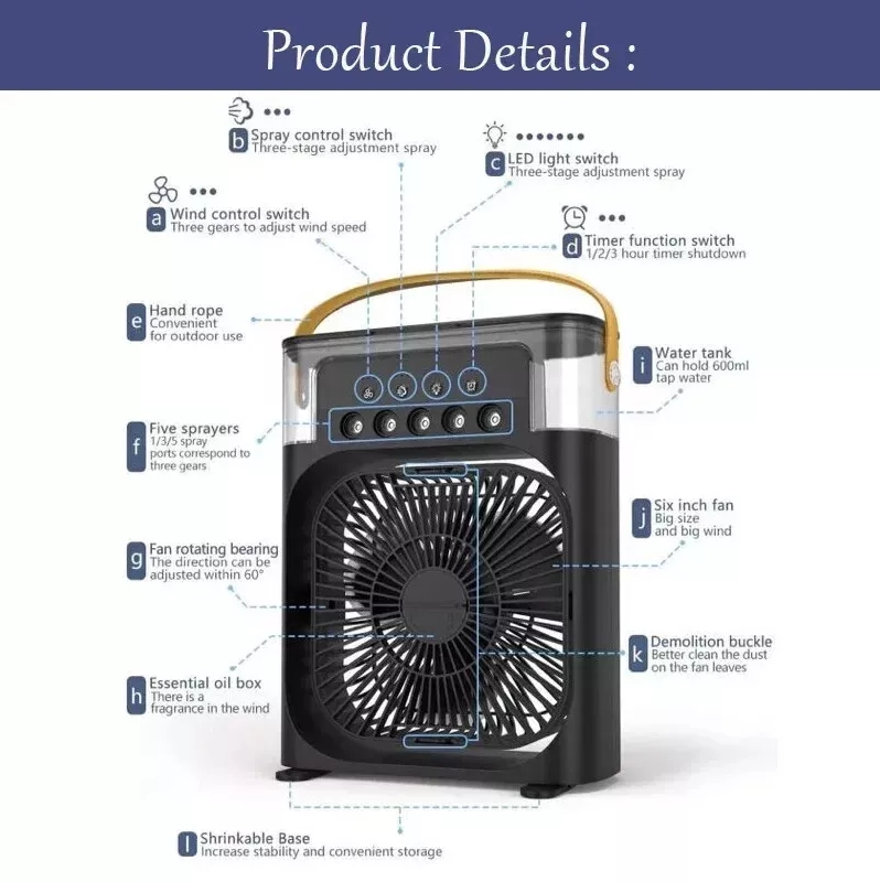 3-in-1 function: includes functions of fan, air conditioner and air humidifier.