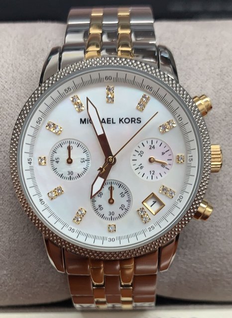 Watch Information: Gender: Women's Case Size: 36mm Dial Color: Mother of Pearl Material Case: Stainless Steel Material Band: Stainless Steel Diamonds: n/a Movement: Analog Quartz Water Resist: 100M Features: Chronograph and Date Additional Info: Packaging: Michael Kors Box & Papers