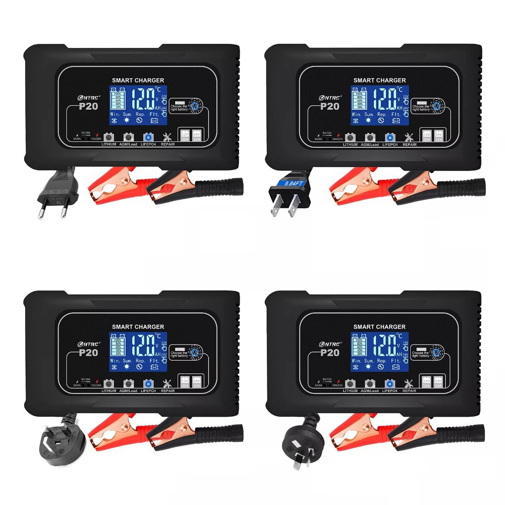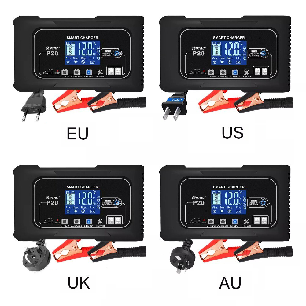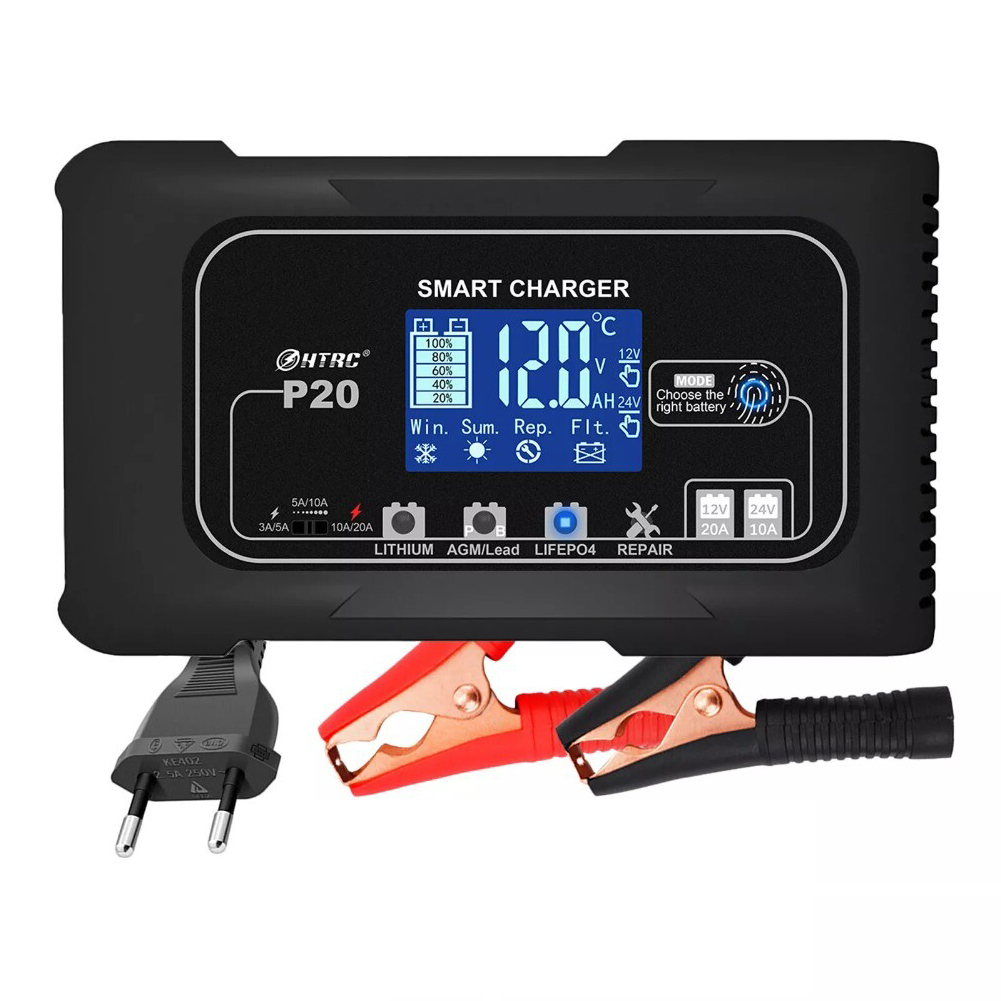 Feature: 1. Charging technology: P20 car battery charger adopts 7-segment intelligent charging technology to obtain the best charging efficiency. Including desulfurization, soft start, batch charging, detection, float charging, etc. 2. Automatically adapt to the external temperature: Winter and summer mode, automatically adapt to the external temperature, automatically adjust the charging voltage, and prevent the battery from being undercharged or overcharged. 3. Protection function: Built-in reverse polarity protection, short circuit protection, overcharge protection and other protection functions to protect your battery. 4. Display screen: Simple operation, touch mode, one-key selection of working mode, simple and convenient operation. With high-definition LCD digital display screen, dynamic display of current, voltage, battery power, temperature and other information. 5. Multi-function: All plastic shell, exquisite and compact. Support 12V and 24V lithium batteries, lithium iron phosphate batteries, lead-acid batteries (including GM, GEL, SLA, Flooded, WET, EFB, etc.). The maximum charging current of 12V battery is 20A, and the maximum charging current of 24V battery is 10A. Widely used for efficient charging of batteries in cars, motorcycles, electric vehicles, boats, lawn mowers, and scooters. Specification: Origin: Mainland China AC input voltage: 100-240V 50/60Hz Output voltage: 12V/24V Output current: 12V@5A, 10A, 20A (24V@3A, 5A, 10A) Output voltage under no load: 27.6V Minimum startup voltage: >7.0V On-load input power: Maximum 280W Input power at no load: 2.8W Net weight: 470g Size: 158x90x50mm/6.22x3.54x1.97in Material: Plastic + metal + electronic components Supported battery types: Lithium battery/lead-acid battery/lithium iron phosphate battery Plug type: EU, US, UK, AU