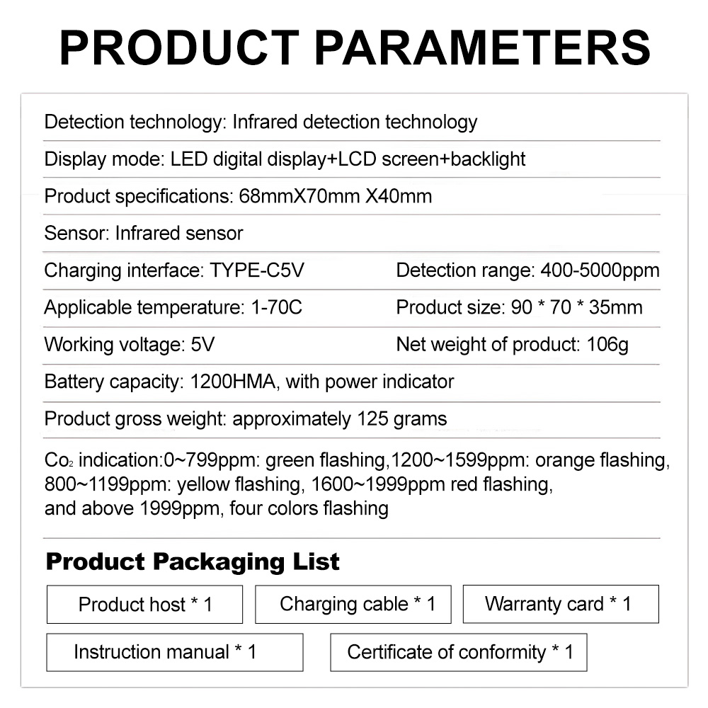 High Precision and Stability: The Carbon Dioxide TVOC HCHO Detector offers excellent accuracy and stable performance with strong anti-interference capabilities, providing you with dependable data.