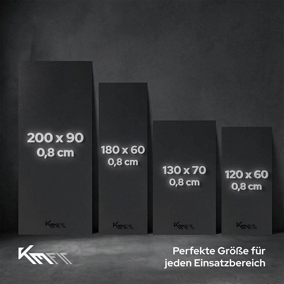 Mit vier verfügbaren Größen (120×60, 130×70, 180×60 und 200×90 cm) bietet die Matte vielfältige Einsatzmöglichkeiten. Je nach Raum und Gerät kannst du genau die passende Größe wählen. Das modellabhängige Gewicht zwischen 1,65 kg und 4,05 kg sorgt zudem für eine stabile Lage und gleichzeitig einfache Handhabung.