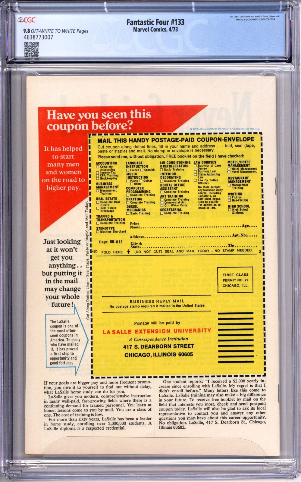 Up for sale is a copy of Fantastic Four #133 Double Cover with both covers graded 9.8 NM/MT with off-white to white pages by CGC. This will be packaged securely between thick sheets of cardboard and bubble wrap and shipped in a box via USPS priority mail with signature confirmation. I do combine shipping on multiple items; feel free to email with any questions.