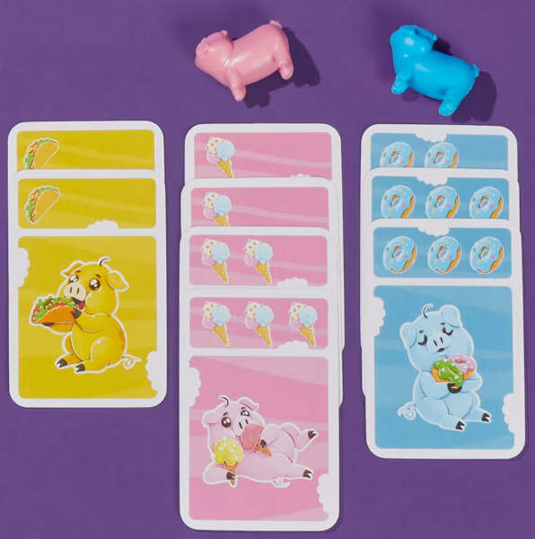 • HOG IT ALL TO WIN: In this light strategy game, players compete to collect pig figures by placing down the most of a particular food card from their hand. Earn points by drawing food cards that match the color of collected pigs
