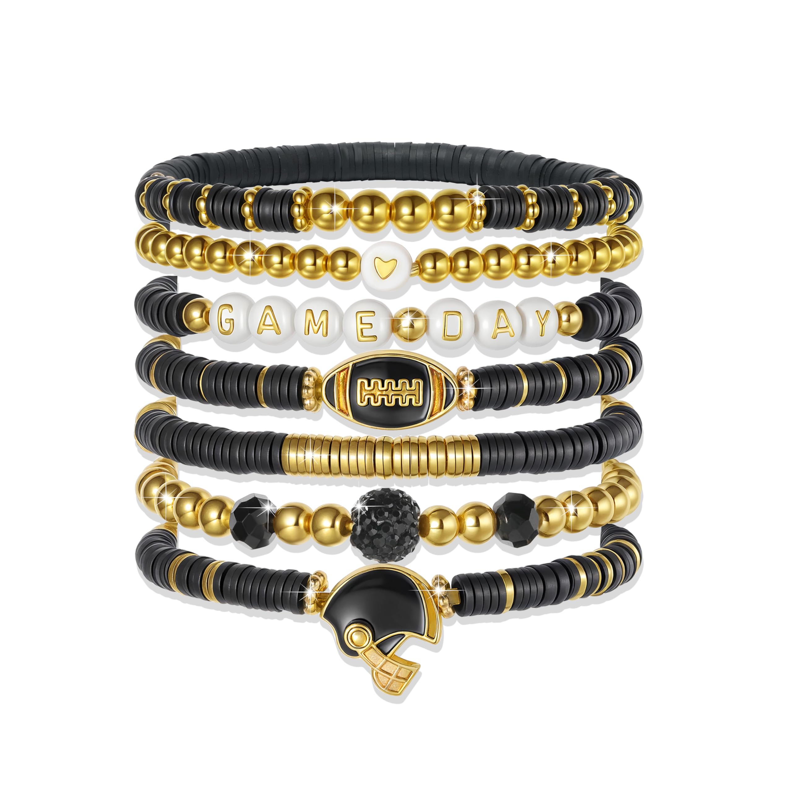 - Gameday essential stack set: Show your team spirit with this complete set of 7 beautifully coordinated, stackable bracelets. Featuring a stylish mix of gold and black clay beads, perfect for creating a layered look on game day or any day.
