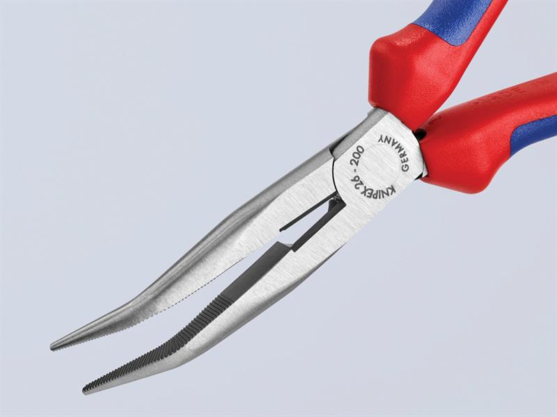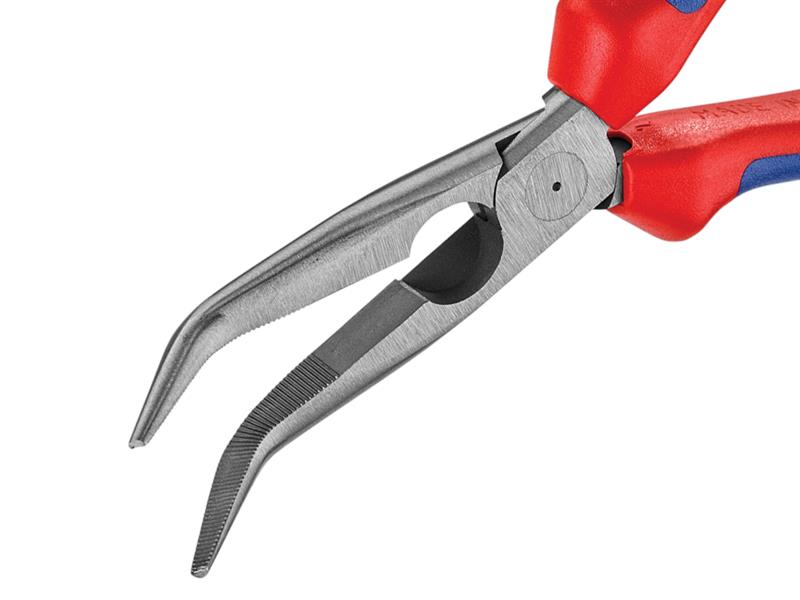 Knipex Pinze a becchi mezzotondi piegati serie 26 con ganasce lunghe semitonde e punte di precisione elastiche e resistenti alla distorsione. Le ganasce sono angolate a 40° e sono ideali per l'uso su componenti elettronici o in aree strette da raggiungere su computer, circuiti o applicazioni per veicoli a motore. 61HRC.
