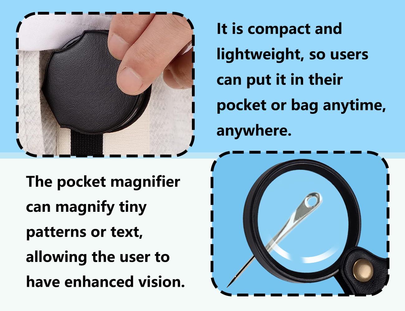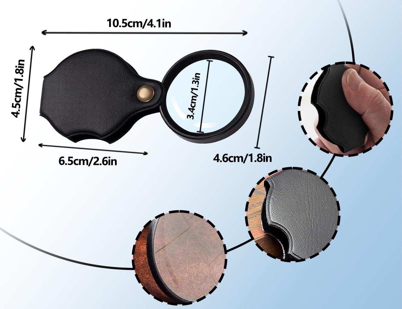 Leicht und einfach zu transportieren: Diese Taschenlupe hat ein faltbares Design, wodurch sie leicht zu tragen und überall zu verwenden ist. Sie eignet sich perfekt für den Einsatz bei Outdoor-Veranstaltungen, auf Reisen, zur Beobachtung von Biologie und mehr.