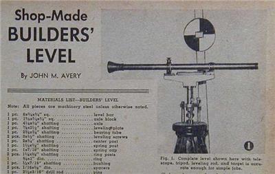 Plans for a Builders Level. Great for laying out small foundations and drainage work. Uses a rifle scope for the telescope. Small lathe work is needed.