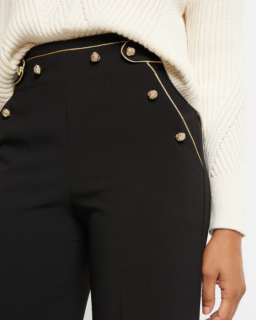 This trouser pant brings you a silhouette that is straight through the leg and past the ankle. This pant offers a unique yet chic look with novelty buttons and gold trim features. Pair back with a simple blouse and a pair of heels.