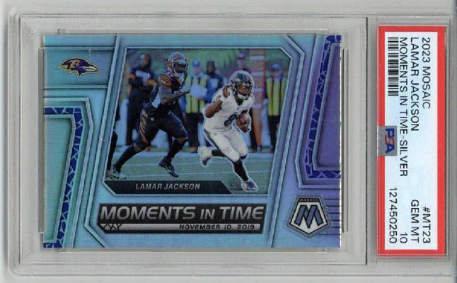 The item you are buying is a PSA GRADED and ENCAPSULATED 2023 Panini Mosaic Moments In Time Silver #MT23 card of Lamar Jackson The card was graded a 10 by PSA. This card comes from my personal collection. The plastic of the encapsulation has no cracks and is scratch free.