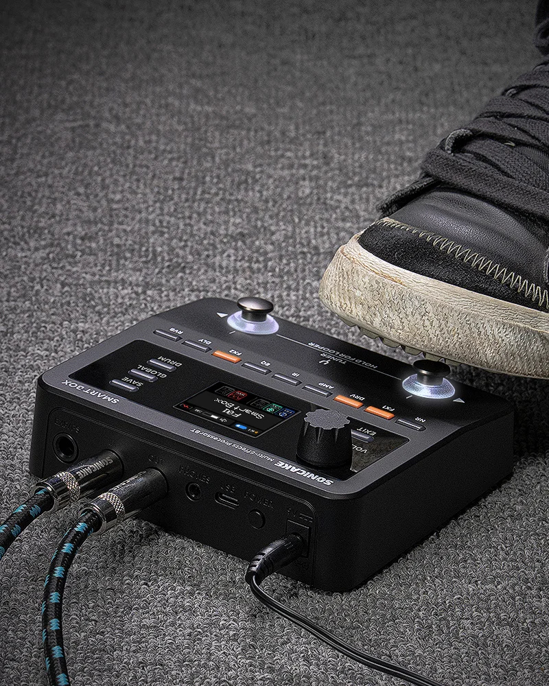 While maintaining a portable size to the greatest extent possible, Smart Box combines intuitive information display and quick interactive functions that are conducive to live performances. The high-definition color LCD screen displays preset information, and 9 shortcut buttons display the on/off status of the effect module. You can also press the button to enter the corresponding module and quickly adjust the effect parameters. You can also connect the Smart Box to the mobile app for more precise adjustments. Two specially designed stomping pins not only have excellent foot feel, but also can be controlled by module switches and timed with multi-color light rings, making it convenient for stage performances. The Smart Box also comes with a TRS control expansion interface that supports external emoji pedals or spikes. If that's not enough, the Smart Box also supports pairing with wireless MIDI devices to expand more control functions and help you perfectly control every performance.