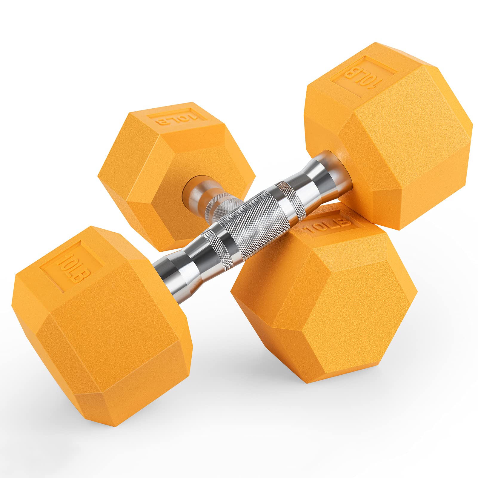 The Portzon 10lb hex rubber dumbbell pair is designed for strength training, conditioning, and home gym workouts. Each dumbbell features a durable rubber-coated hex head to help protect floors and prevent rolling during exercises. The contoured, non-slip handle provides a secure and comfortable grip, making these weights suitable for a wide range of workouts including strength training, toning, functional fitness, and rehabilitation exercises. The bright orange finish adds visibility and a clean, modern look to any workout space.