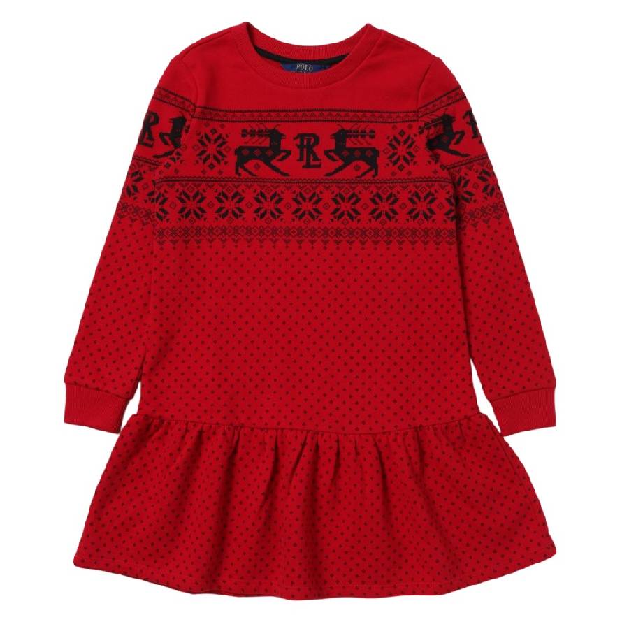 Polo Ralph Lauren Girls Dresses. Fashion category: Casual Dresses. SKU: 313928205001. Color: Red. Polo Ralph Lauren Girls Deer-Print Long Sleeve Dress. The dress features a cotton-blend fleece fabric, deer print, a regular fit, sitting above the knees, a drop-down flared hemline, ribbed cuffs, crew neck, and long sleeves. 88% cotton, 12% polyester.